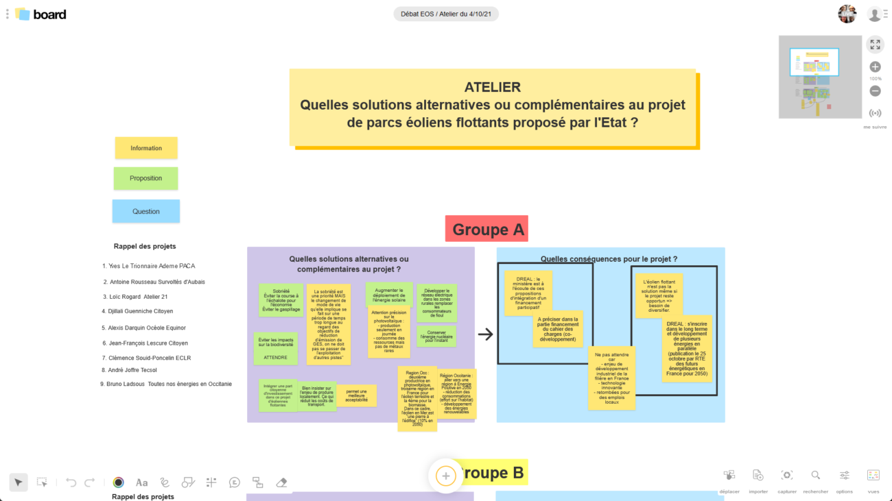 Quels projets alternatifs et solutions complémentaires au projet de parcs éoliens flottants porté par l’Etat ? L’équipe du débat EOS a proposé lors de cet atelier thématique la présentation et l’échange autour des projets alternatifs et des solutions complémentaires présentés de manière synthétique par les acteurs ayant soumis leur propositions en amont.